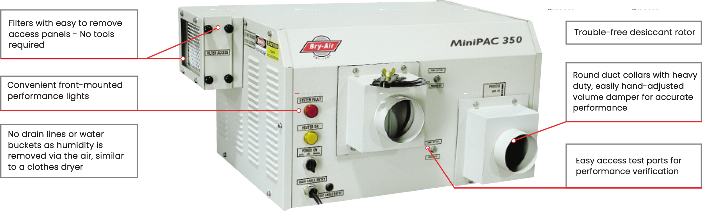 Bry-Air’s MiniPAC® dehumidifier is the ideal dehumidification solution for facilities in need of reliable humidity control or mould and mildew protection. The MiniPAC® can be installed as a stand-alone unit or attached to any central air conditioning system to enhance the system’s dehumidification capability. It is a small, yet powerful unit that combats the effects of moisture in up to 10,000 sq. ft.* and is ideal for a wide variety of applications.